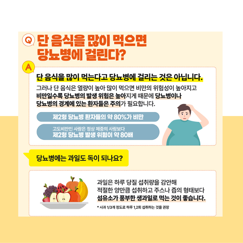 단음식을 많이 먹는다고 당뇨병에 걸리는 것은 아니지만 단 음식은 열량이 높아 과섭취시 비만이 될 확률이 높아지고, 비만은 당뇨병의 위험요인입니다. 따라서 당뇨병 혹은 경계에 있는 환자들은 주의가 필요합니다.
