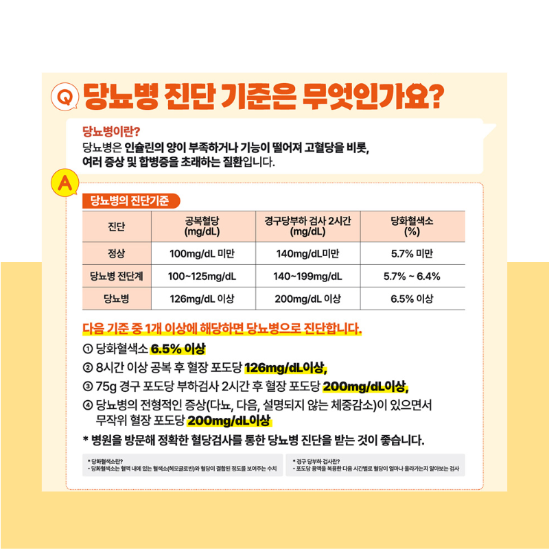 위 4가지 중 하나가 해당된다면 당뇨병 기준에 해당되므로 병원을 방문해 정확한 혈당검사를 통한 당뇨병 진단을 받는 것이 권고됩니다.