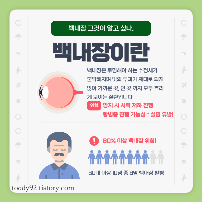 백내장이란 ? 노인들에게 가장 흔히 발생하는 눈 건강 문제 중 하나로, 눈의 렌즈가 투명성을 잃고 흐려지는 상태를 의미합니다. 이로 인해 시력이 점차 저하되며, 특히나 노인성 백내장은 우리